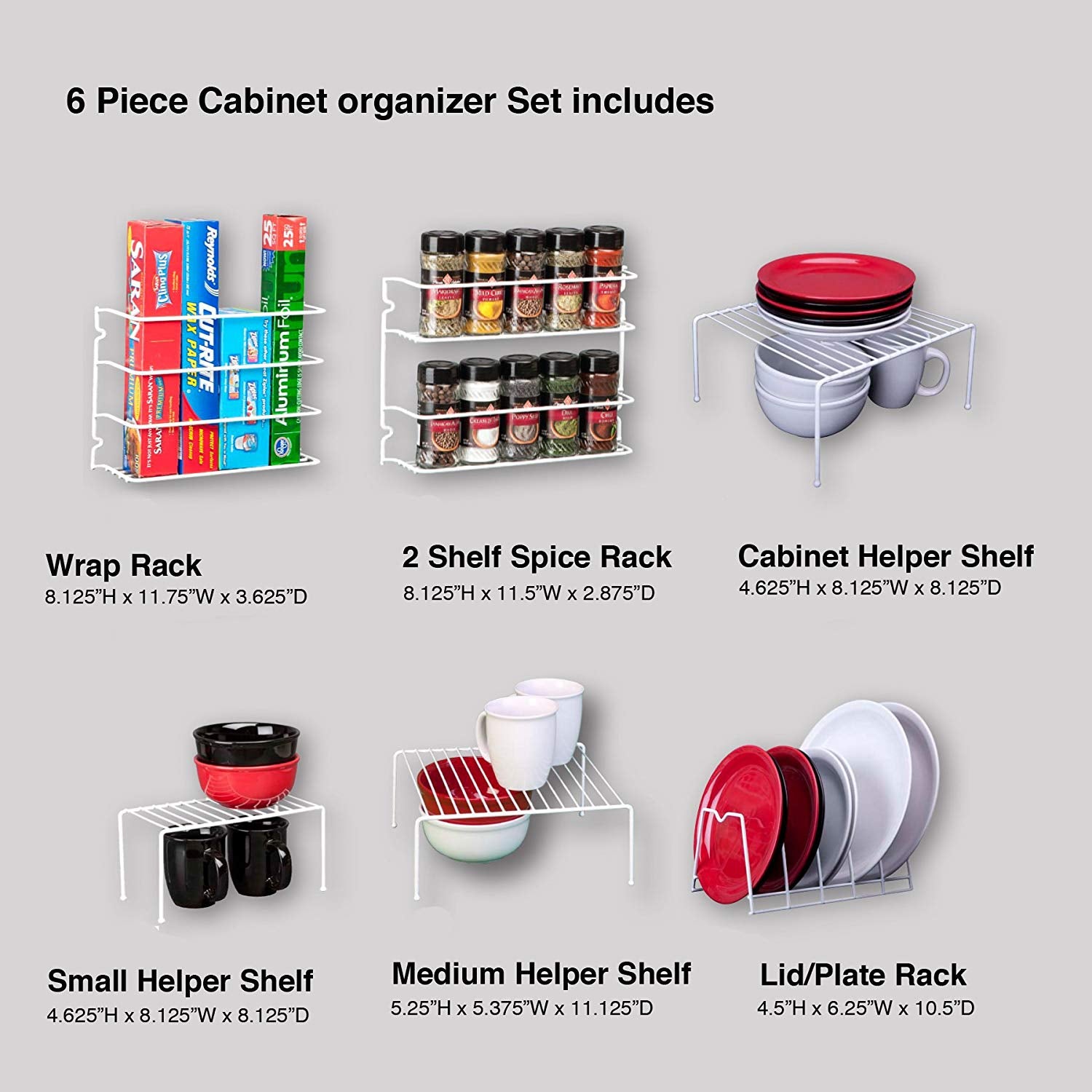 Tamaño: 1 paquete. El juego de 6 piezas incluye los organizadores de cocina más populares. Incluye 3 estantes de apoyo en diferentes tamaños, un organizador para especias, un organizador para envolturas y un clasificador para platos o tapas. Este juego es perfecto como un organizador de cocina todo-en-uno.