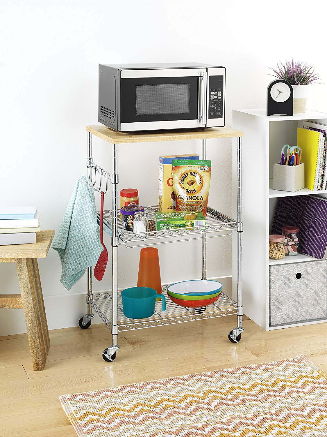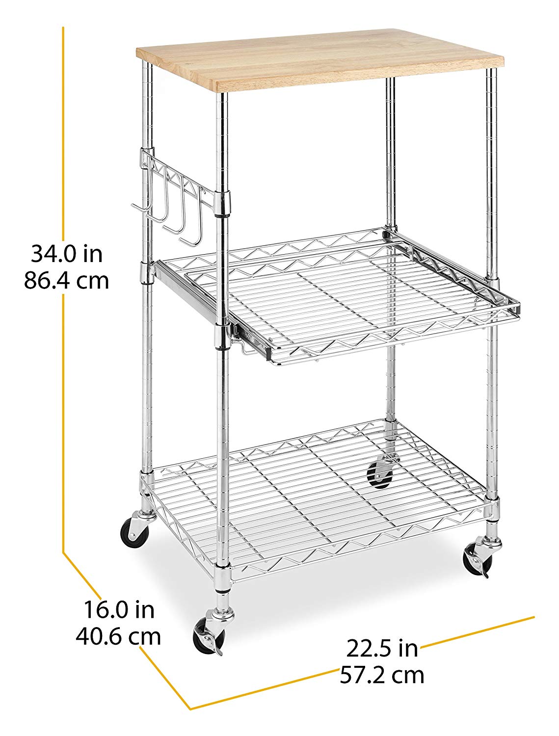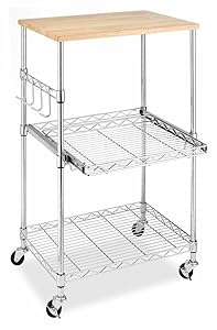 Functional, portable, and efficient, Whitmor 6056-3536 Supreme Microwave Cart is the solution to your kitchen storage needs. The cart is made up of a steel frame with chrome finish for stability and durability. The unit consists of three shelves, the bottom two adjustable in height, provides customized storage space. The four hooks provided on the side of the cart are perfect for hanging kitchen utensils or towels. The top of this handy Microwave Cart is actually a birch wood cutting board that can be removed and used for food preparation. A 10 year warranty reflects the quality and durability of this Supreme Microwave Cart.